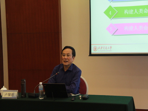 卢黎歌教授以十九大报告中习近平总书记关于人类命运共同体思想的阐述为引入点,围绕“回应时代变化的中国智慧和方案,构建人类命运共同体思想的渊源、形成与发展,构建人类命运共同体思想的主要内容,构建人类命运共同体思想的基础与意义”四个主要方面作了详细、深入和科学的阐释。尤其对习近平总书记构建人类命运共同体思想对时代难题的回应、人类命运共同体思想的理论渊源、思想体系和特征、世界认同和实践路径等方面做了细致入微的说明和阐释,得出人类命运共同体的价值超越是对资本主义经济全球化道路的历史性超越,是对全球治理体系霸权化道路的系统性超越,是对西方文化中心主义的辩证性超越的结论。