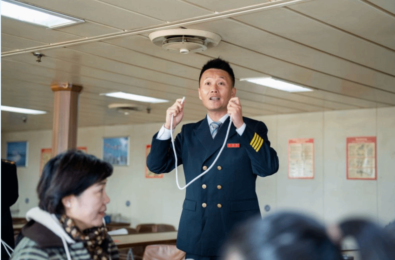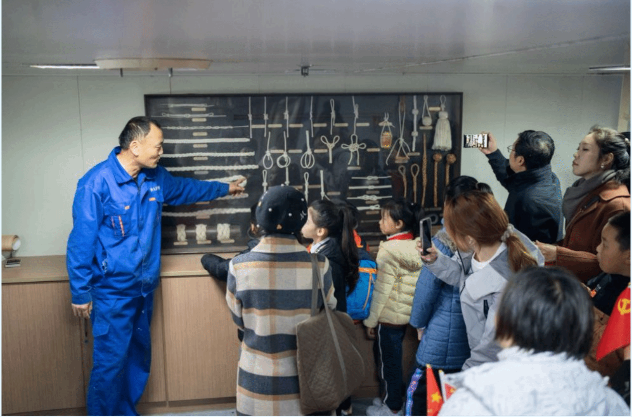 四是漫步“育鲲”轮。这是一次深入了解现代航海技术和航海文化的绝佳机会。在专业人员的引导下,大家参观了驾驶室、船舱、水手绳结工作室,近距离观察了船员的生活空间和工作环境,学习了船舶系统、通讯设备以及安全操作规程等知识。同时,师生们还体验了救生艇的使用,学习了如何快速、有序地登上救生艇,了解了在海上求生的基本技能。这一环节不仅增加了活动的趣味性和互动性,也让参与者们深刻认识到了海上安全的重要性。