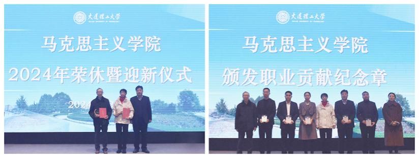 述职大会后,学院举行了2024年荣休暨迎新仪式。刘志礼院长为荣休教职工戴艳军教授、胡光教授颁发证书。两位教授对学院的关心关爱表示衷心感谢,并祝愿学院凝心聚力,实现全方位、高质量、内涵式发展。随后,戴艳军教授和胡光教授为来校工作20年、30年的教职工颁发职业贡献纪念章,并为今年新入职教师佩戴了校徽。