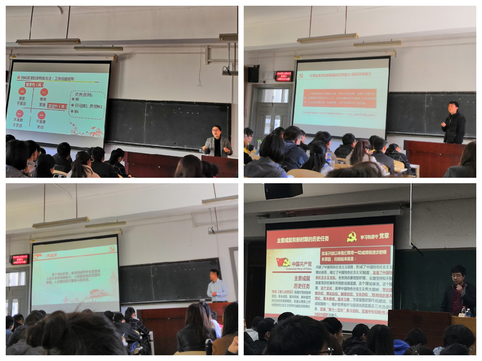 本次入党积极分子培训围绕理论学习(包括系统授课和专题报告)、综合提升(包括综合测试和社会实践)撰写培训总结和结业考试4个环节展开。前期的理论知识储备阶段,学员们自主学习了网上专题必修培训课程:《中国共产党的指导思想》、《党员的权利与义务》、《端正入党动机,争取早日加入中国共产党》以及其他选修课程。通过学习,在原有知识的基础上进一步加深了入党积极分子对党的指导思想、党规党章等理论知识的了解。另外,学员们还现场听取了《合格接班人的生涯规划成长路径》、《大学生党员应具备的核心能力》、《忆红色党史,坚定入党初心》、《党员发展要求及程序浅析》、《十九大新党章解读》等与积极分子紧密相关的专题讲座,主讲老师结合入党积极分子当前的发展现状,从人生规划、能力素质、入党动机、入党程序等方面对入党积极分子提出了新的发展建议和要求,加深了学员对党的发展历史的了解,提升了学员对新时代党的各项路线、方针、政策的认识。